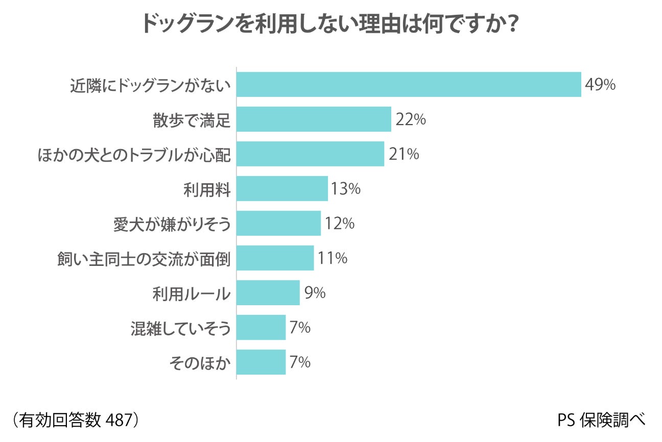 ドッグランを利用しない理由は、近隣にドッグランがない、散歩で満足、ほかの犬とのトラブルが心配だから。