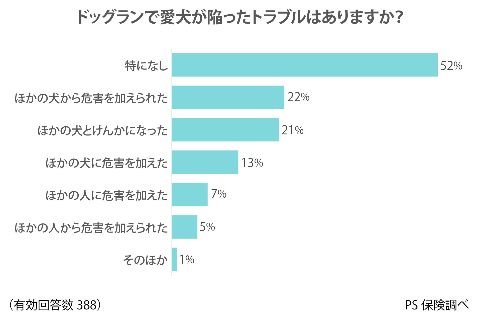 ドッグラン利用中に愛犬が陥ったトラブルについて伺いました。「特にない」という回答が最も多く、全体の52%を占めました。しかし、愛犬が「ほかの犬から危害を加えられた」(22%)、「ほかの犬とけんかになった」(21%)という回答もあり、少なからずトラブルが発生しているようです。