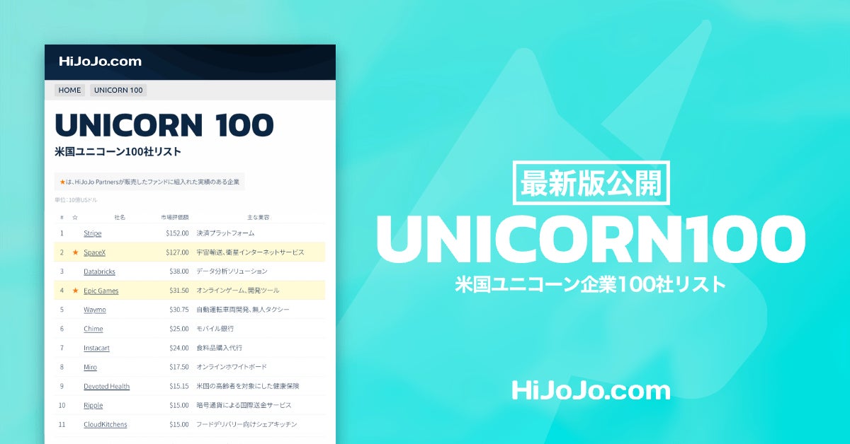 非上場スタートアップへの投資プラットフォームのHiJoJo Partners株式会社(本社:東京都港区、代表取締役:スピリドン・メンザス、以下HiJoJo Partners)は、米国に本拠を置くユニコーン企業(*1)を企業評価額順に100社リストアップした米国ユニコーン企業100社リスト「UNICORN100」(*2)の最新版をHiJoJo Partnersの投資家向け情報サイト「HiJoJo.com(https://www.hijojo.com/)」で公開しました。