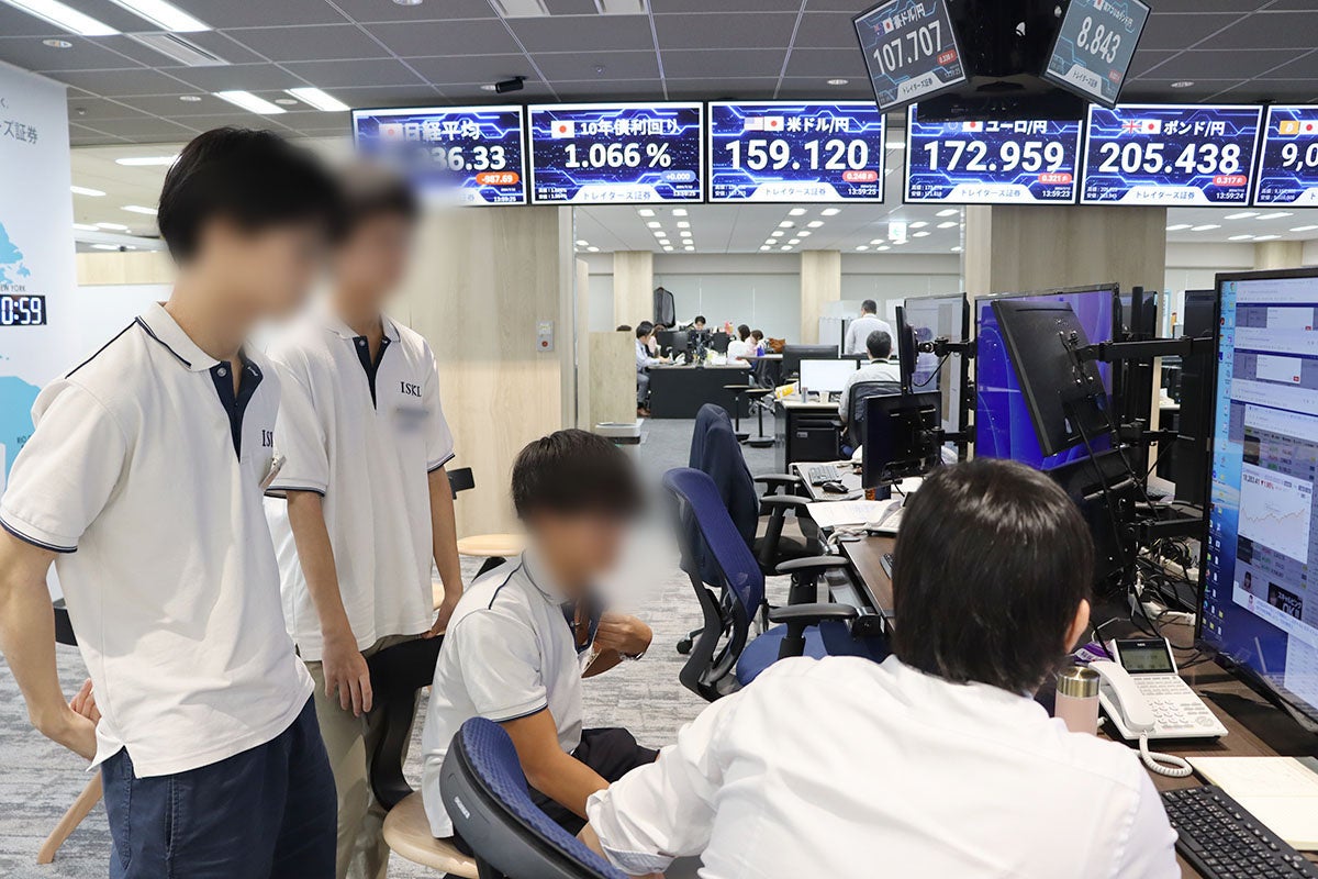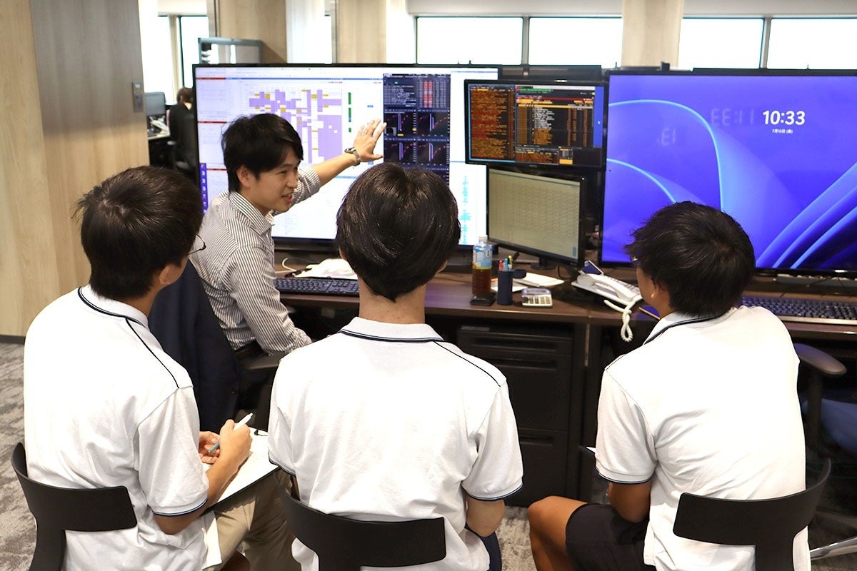 本プログラム前日には、重要な経済指標である米消費者物価指数(CPI)が発表され、米連邦準備制度理事会(FRB)による利下げ観測が強まったところに、政府・日銀による為替介入が行われたと見られ、米ドル/円が急落する事象が発生していました。翌プログラム当日もマーケットの値動きは荒く、緊張感が漂うディーリングルームでメンターを務める為替ディーラーのすぐ傍から参加高校生に業務の様子を観察していただきました。