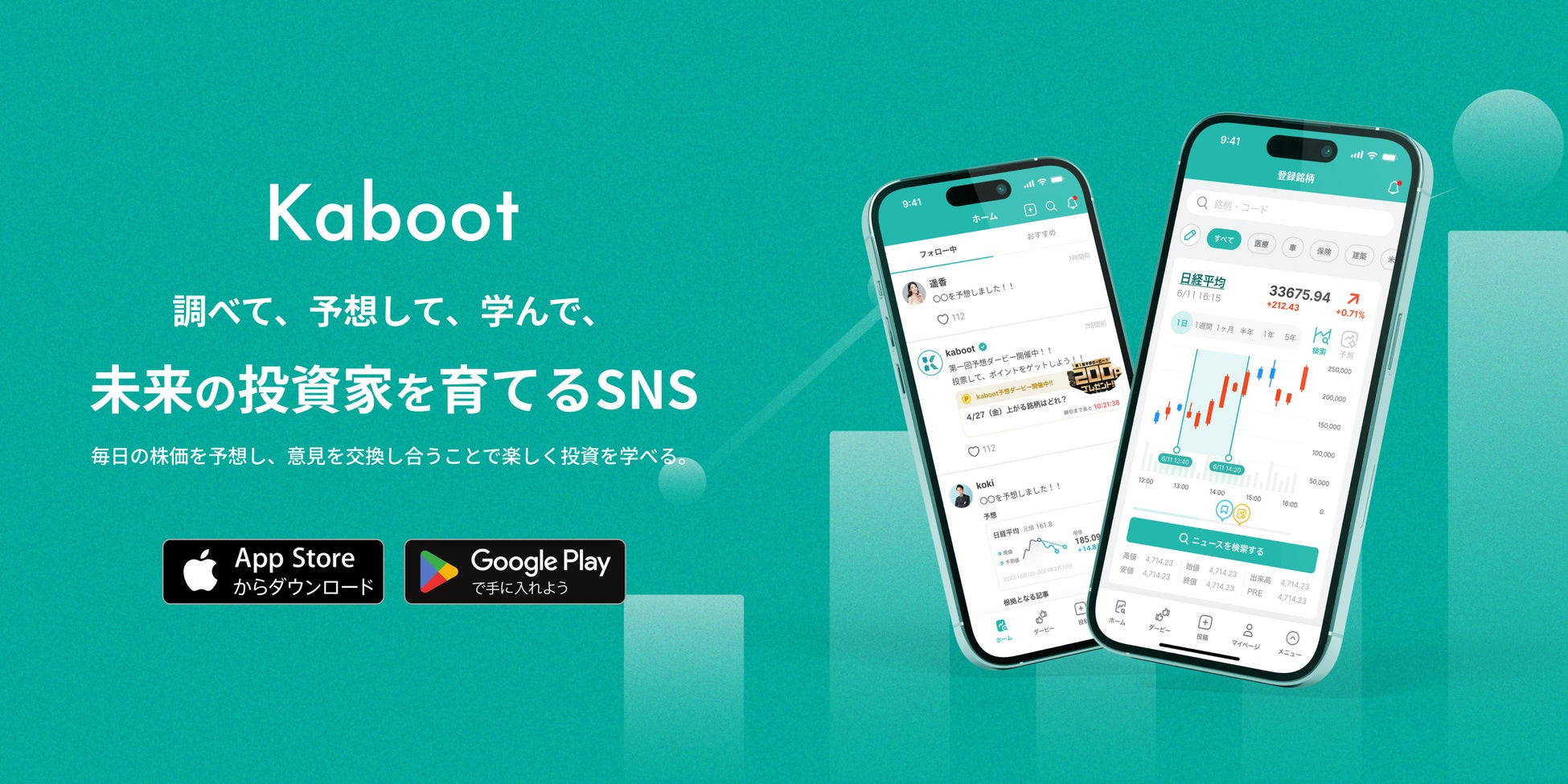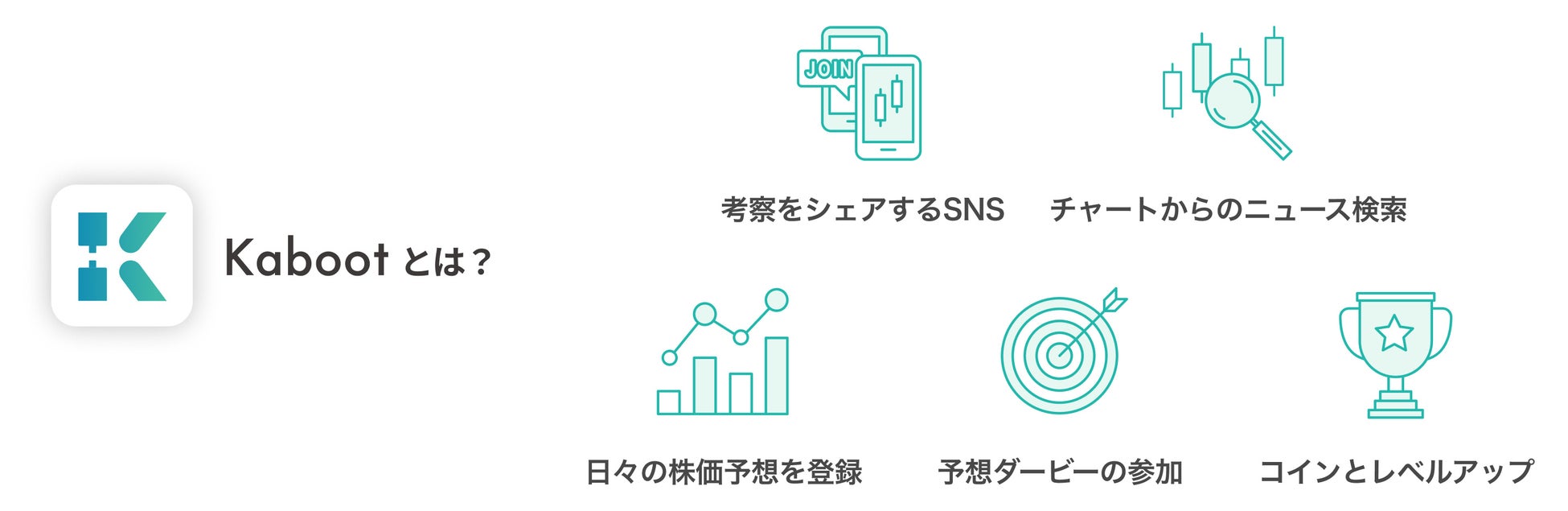 株式会社Kaboot(本社:東京都港区、代表取締役:白石 還、以下 Kaboot)は昨今高まりを見せる金融教育のニーズに応えるべく、「なぜ株が上がった/下がったのか?」を簡単に調べ、クイズ感覚で株価を予想し、資金を使わずに楽しく投資学習に取り組むことができるアプリを開発しました。