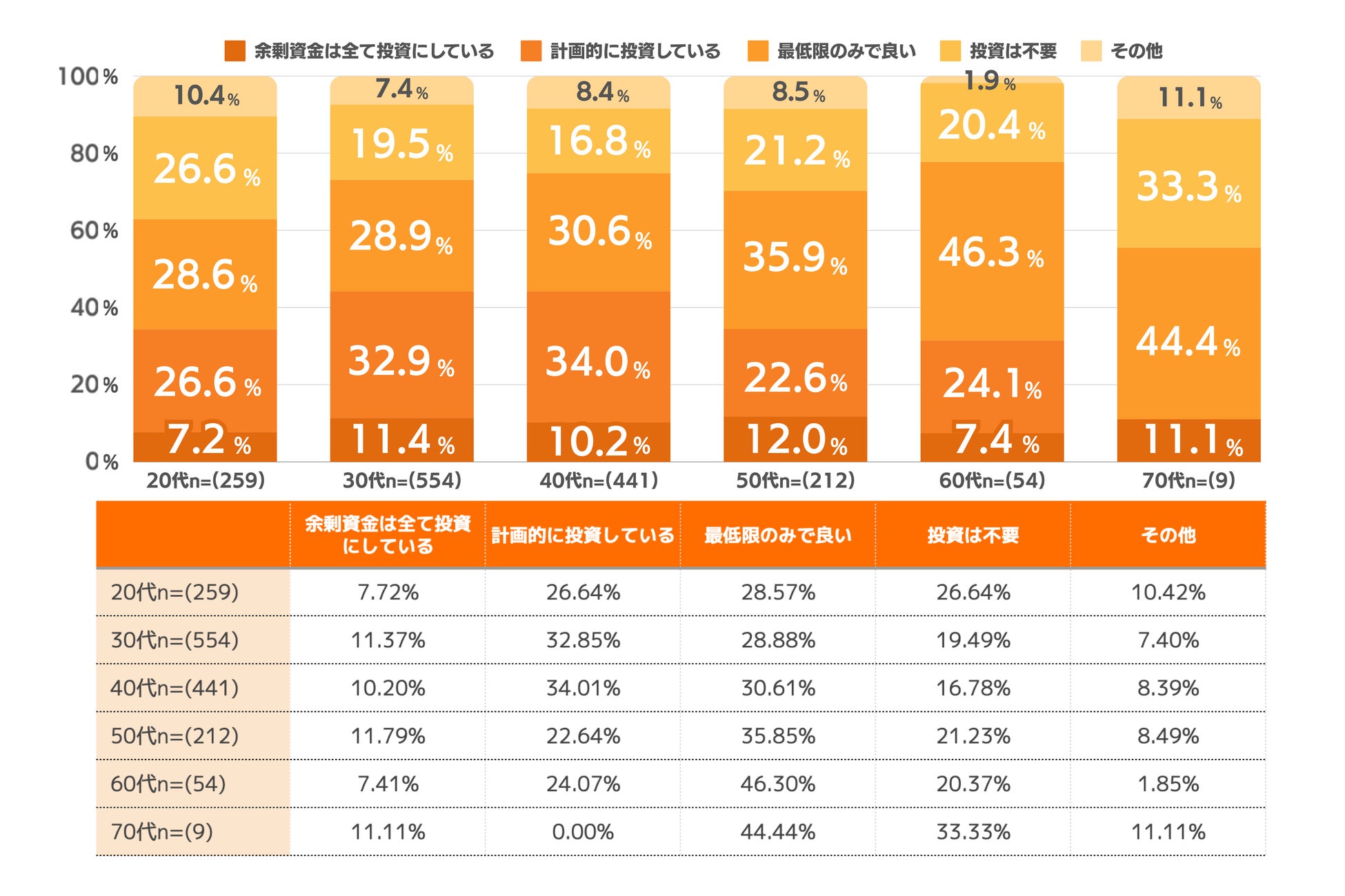 「最低限で良い」「投資は不要」と回答した人の比率は年代が上がるにつれて徐々に多くなっていることがわかります。