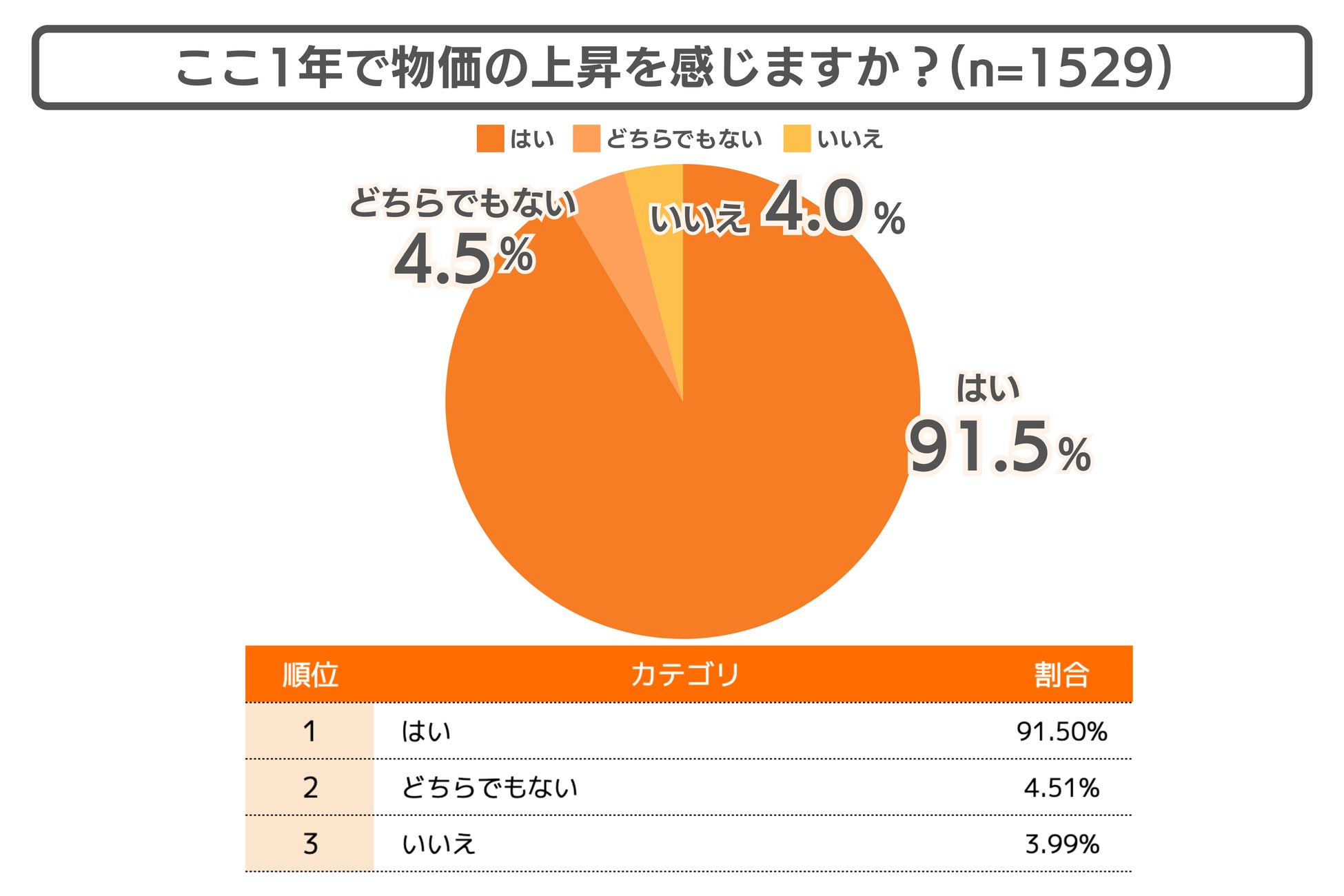 直近1年で物価の上昇を感じている人は90%以上でした。