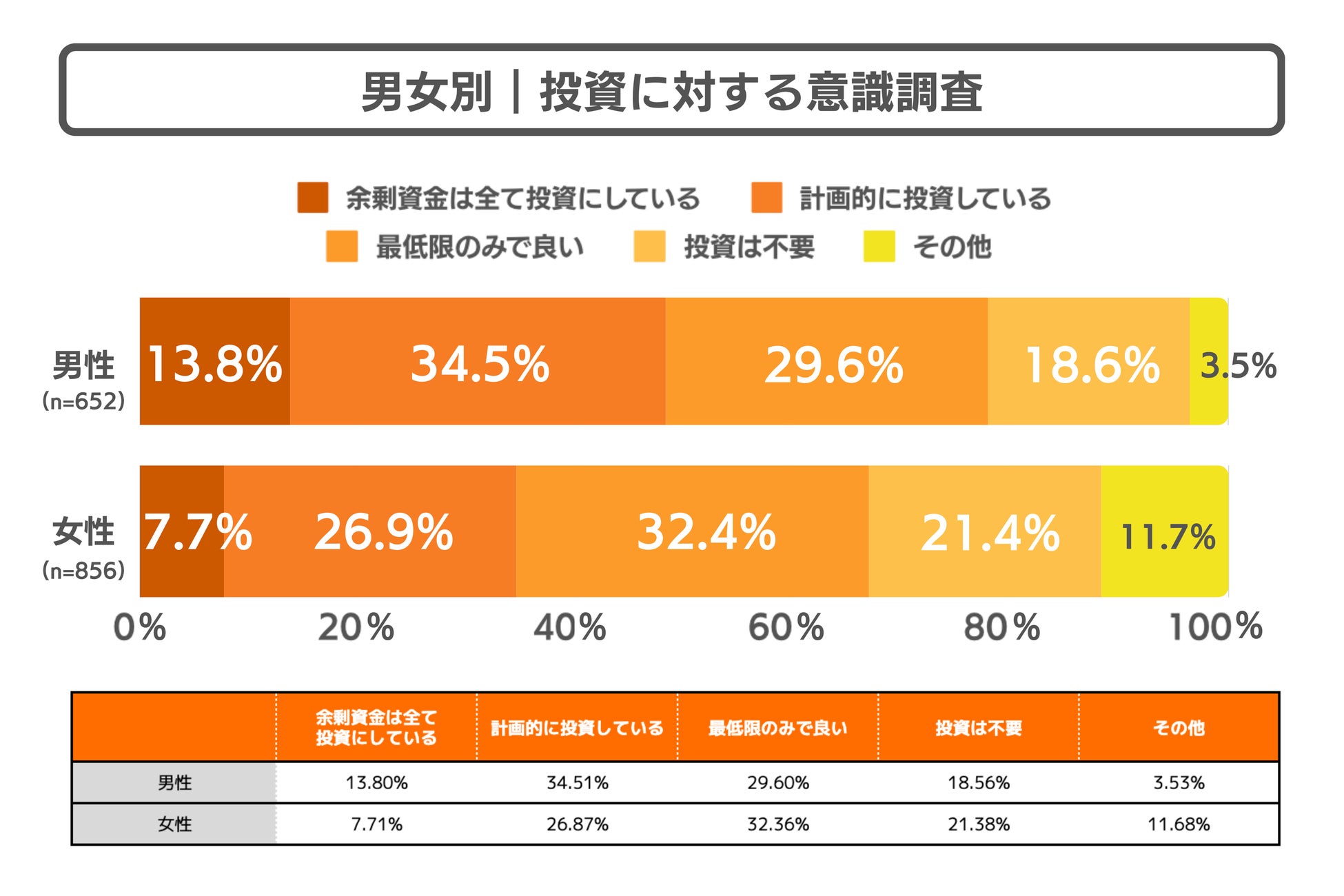 計画的に投資している人は男性で34%、女性で26%という結果になりました。