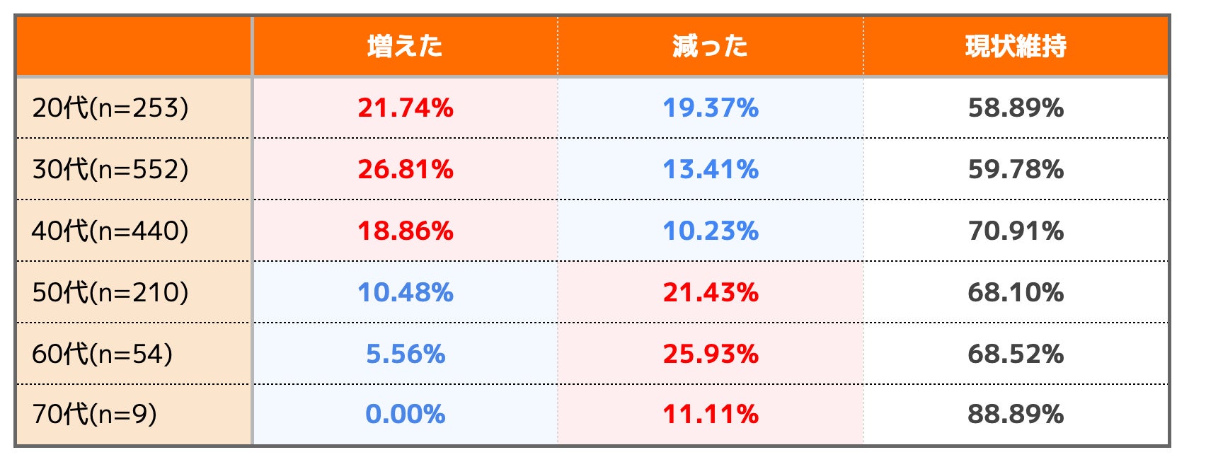 年代が高くなるにつれて「現状維持」または「減った」と答えた人の割合が増えています。