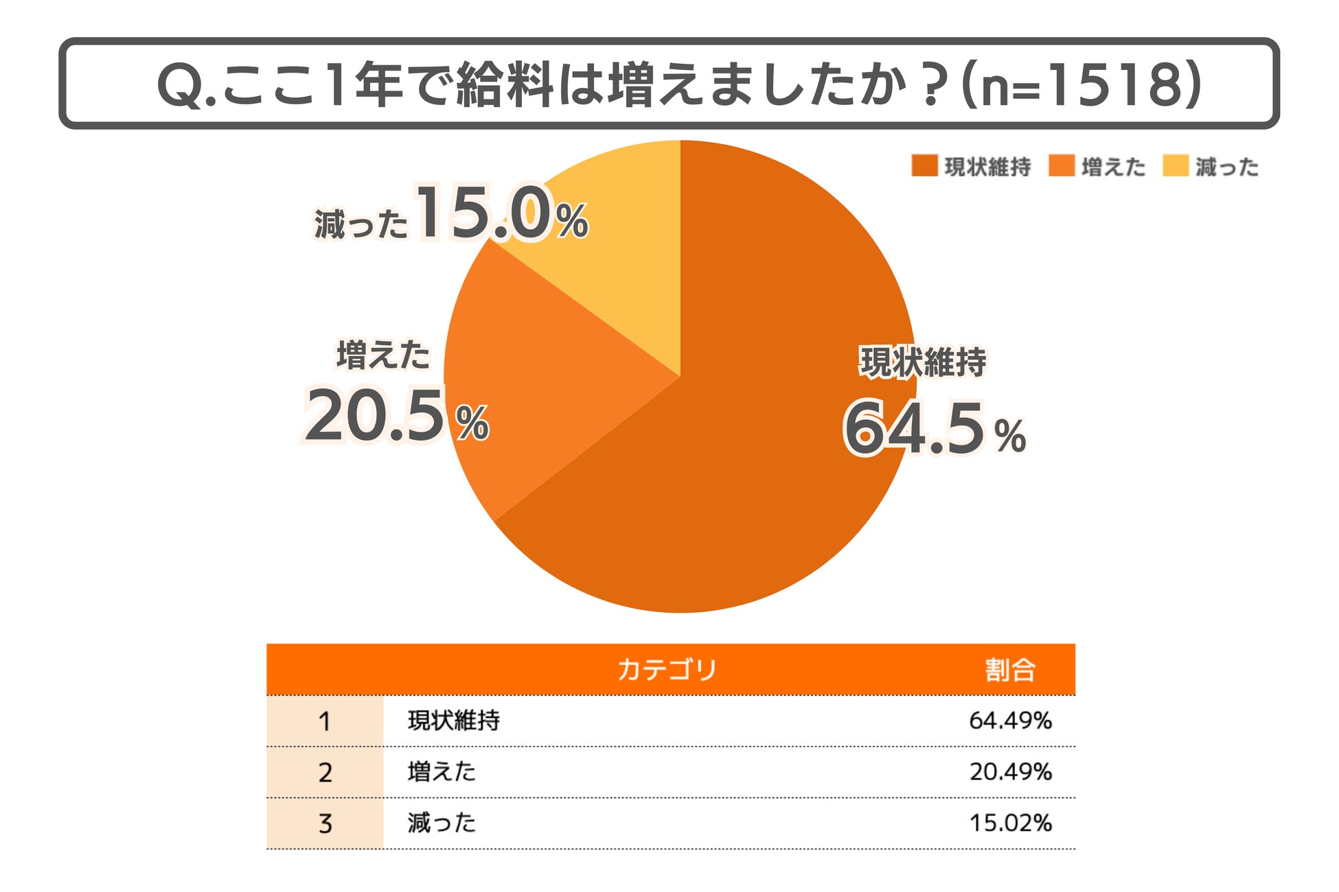 ここ1年で給料が増えたかどうかのアンケートでは「現状維持」と回答した方が最多でした。
