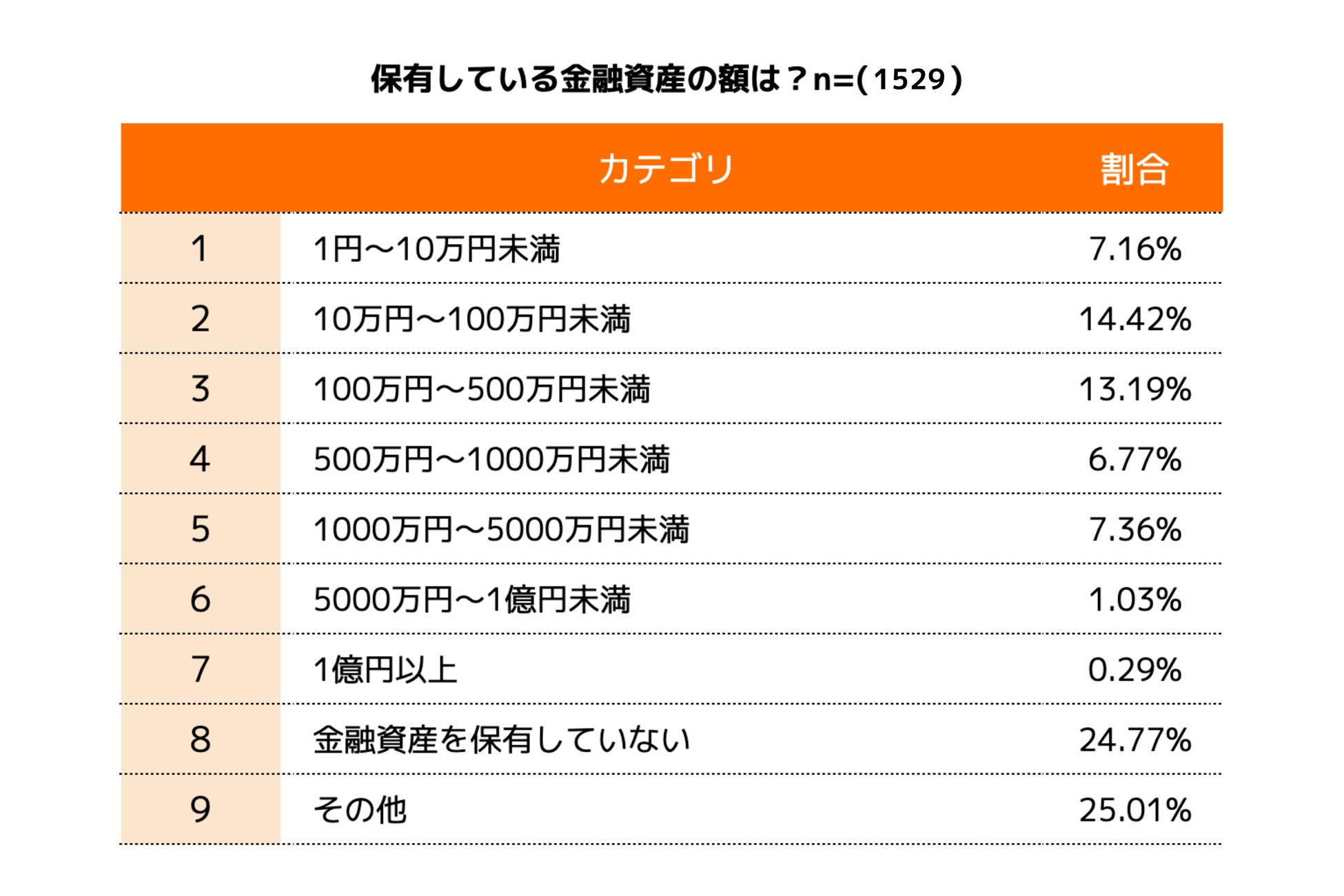 保有している金融資産の額で1番多いのは10万円〜100万円未満で14%程度の方が該当すると回答しました。