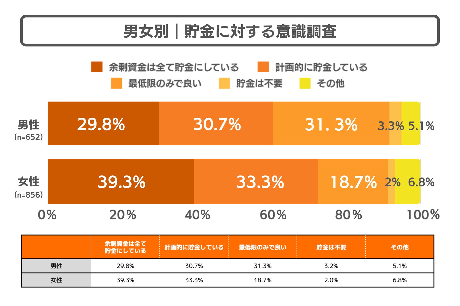 「余剰資金は全て貯金にしている」と回答した割合は男性が約30%だったのに対して女性は約39%でした。