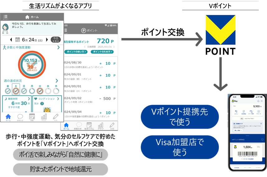「生活リズムがよくなるアプリ」は、日立システムズが2022年2月からサービスを提供している、企業の健康経営を支援する「健康支援サービス(健康経営)」の従業員向けアプリケーションです。本アプリケーションは従業員一人ひとりの、からだとこころのセルフケアをサポートしており、歩行や中強度運動をすることや、気分のセルフケアを登録することでポイントを貯める機能を有しています。この度、貯めたポイントを、10ポイント→1ポイントのレートでVポイントに交換できるようになります。交換したVポイントは、日本全国のVポイント提携先や世界中のVisa加盟店での利用が可能です。