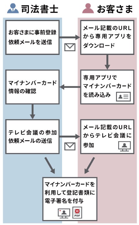 ③司法書士がテレビ会議の参加依頼メールを送信しますので、メール記載のURLからテレビ会議で司法書士と面談を行ってください。その際にマイナンバーカードを利用して登記書類に電子署名を付与いただきます。