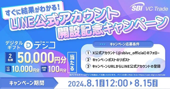 SBI VCトレード株式会社(本社:東京都港区、代表取締役社長:近藤 智彦、以下「当社」)は、2024年8月1日(木)12:00より、「LINE公式アカウント開設記念キャンペーン ~最大50,000円分のデジタルギフトが当たる!~」を実施することをお知らせいたします。