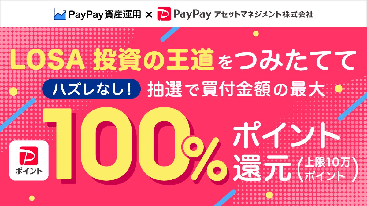キャンペーン期間中に、「PayPay資産運用」において「LOSA長期保有型国際分散インデックスファンド(愛称:LOSA 投資の王道)」を100円以上つみたて購入(約定)した方を対象に、抽選でつみたて購入金額に対して最大100%のPayPayポイントをプレゼントします。なお、2024年9月30日(月)まで、対象の投資信託を売却せず保有していることが条件となります。