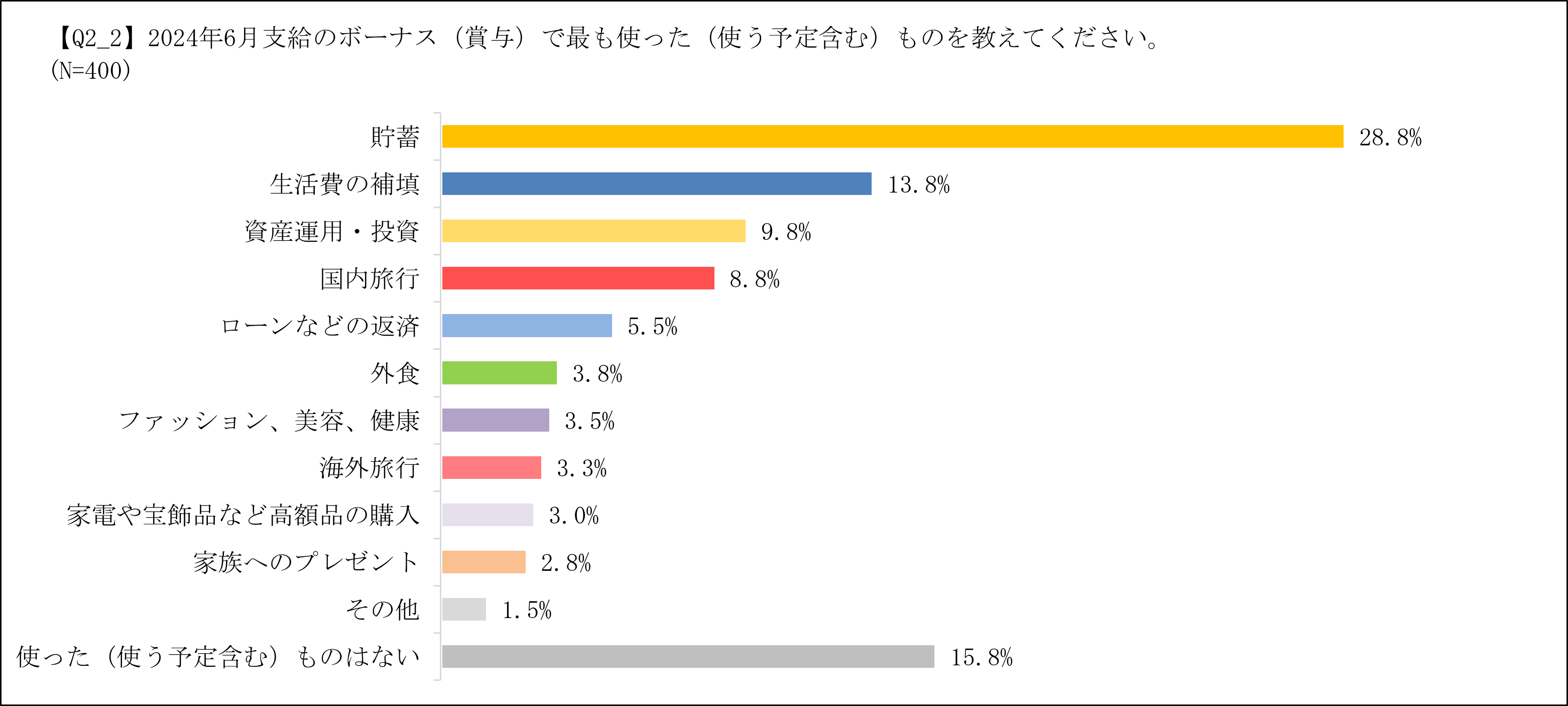 ・2024年6月支給のボーナスの使い道の上位3つは、「貯蓄(28.8%)」、「生活費の補填(13.8%)」「資産運用・投資(9.8%)」。