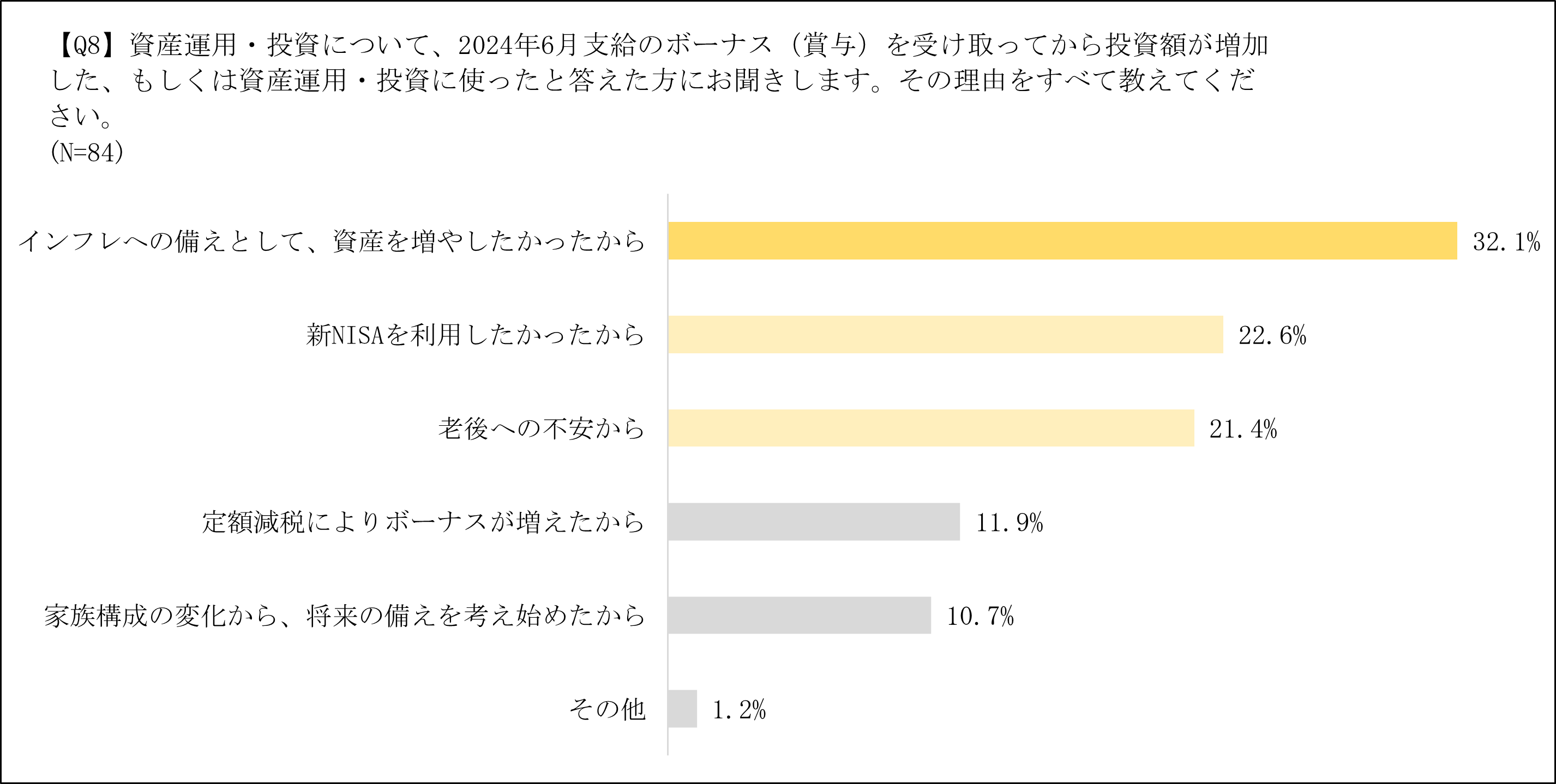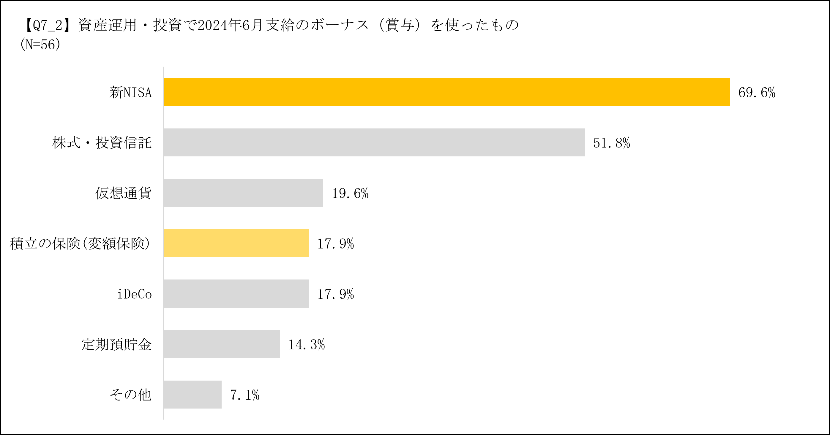 続いて、現在資産運用・投資を行っている方に2024年6月支給のボーナス(賞与)を受け取ってから投資額に変化はあったかを伺うと、約35%の人が投資額を「増やした」、「やや増やした」と答えた(Q6)。また、資産運用・投資で2024年6月のボーナス(賞与)を使ったものを伺うと、今年の1月から始まった「新NISA」が最も多く、2024年6月のボーナス(賞与)を「資産運用・投資」に使用した人の約7割(69.6%)が「新NISA」に拠出したことがわかった(Q7_2)。さらに、資産運用・投資を行っている人、今後資産運用・投資を行う予定の人へ拠出先を伺っても「新NISA」が最も多く、「新NISA」への消費者の関心度が高いことが伺えた。