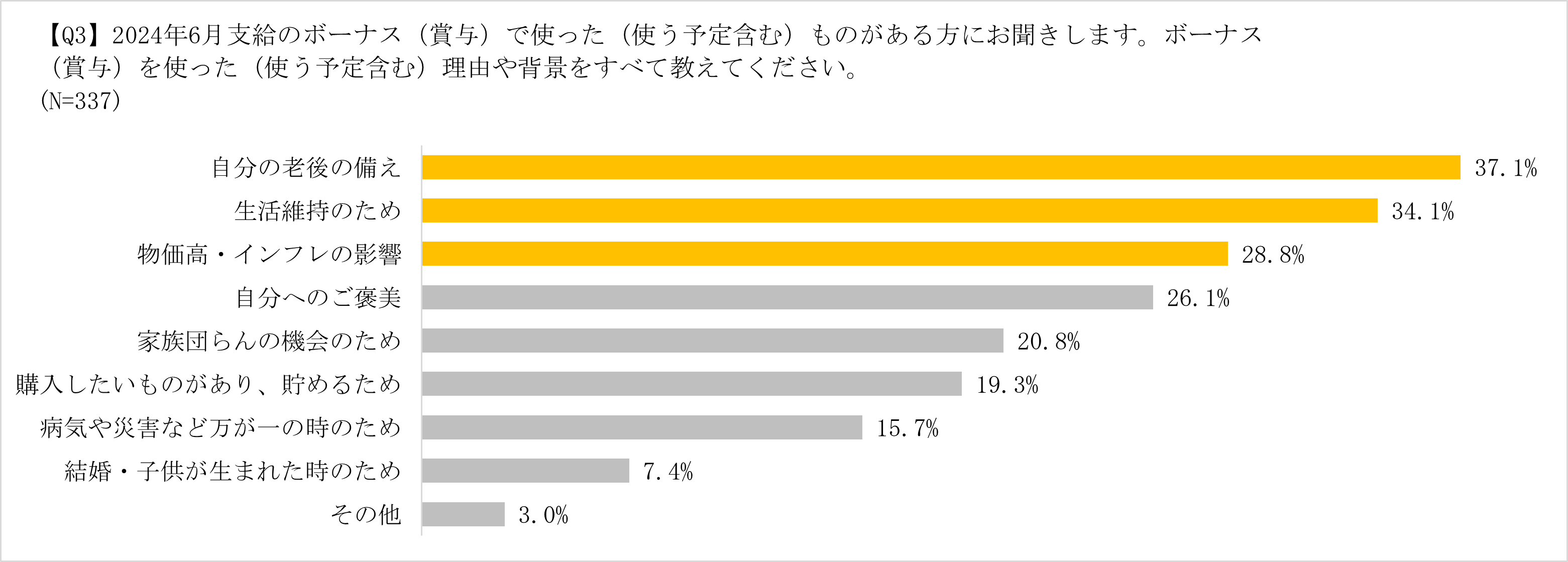 2024年6月支給のボーナスを使った(使う予定含む)方に、ボーナスを使った(使う予定含む)理由や背景を伺ったところ、「自分の老後の備え」と答えた人が最多となった(37.1%)。また、理由の第3位に「物価高・インフレの影響(28.8%)」がランクインし、長らく続く物価上昇によりボーナスの使い道を検討した人が4人に1人以上いることがわかった。