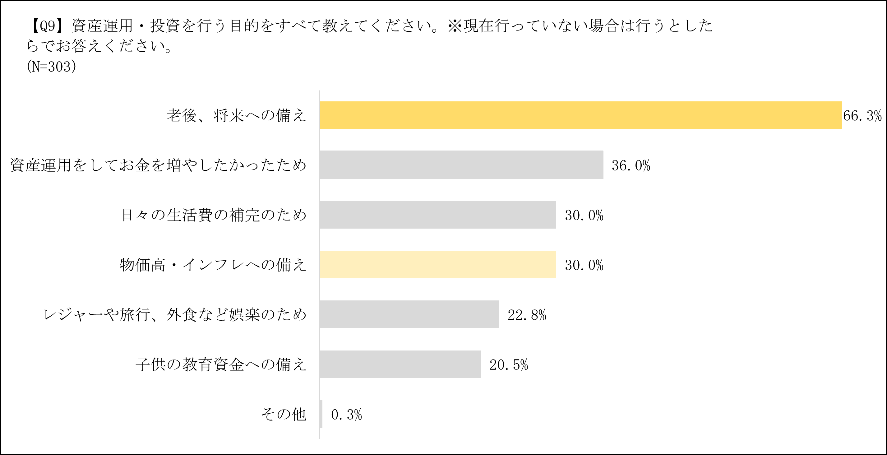 資産運用・投資について、2024年6月支給のボーナス(賞与)を受け取ってから投資額が増加した、もしくは資産運用に使ったと答えた方へ、その理由を伺うと、「インフレへの備えとして、資産を増やしたかったから(32.1%)」が最も多く、約10人に3人以上の人が昨今の物価高やインフレの影響を踏まえ資産運用・投資の拠出額を増額していることがわかった(Q8)。さらに、資産運用の目的を伺うと、「老後、将来への備え(66.3%)」が最も多く、約10人に3人が「物価高・インフレへの備え(30.0%)」として資産運用・投資を行っていることがわかった(Q9)。このことから、「老後や将来への備え」、「物価高・インフレの備え」など、物価高や将来に起こるもしもの備えとして、資産運用・投資を行っている人が多いことがわかった。