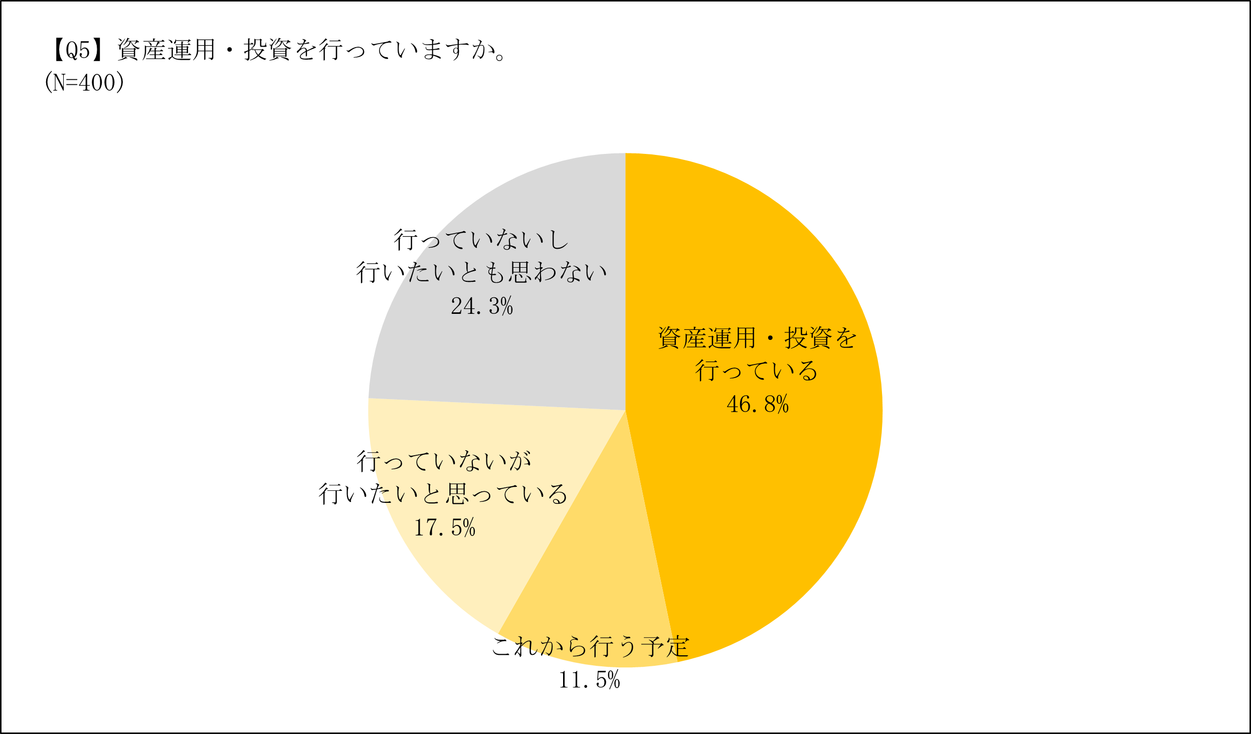 調査対象とした20-50代の現役社会人に現在、資産運用を行っているかと伺ったところ、現在資産運用を行っている人が、全体の約5割(46.8%)とわかった。さらに、今後資産運用を行いたい人を含む、資産運用に関