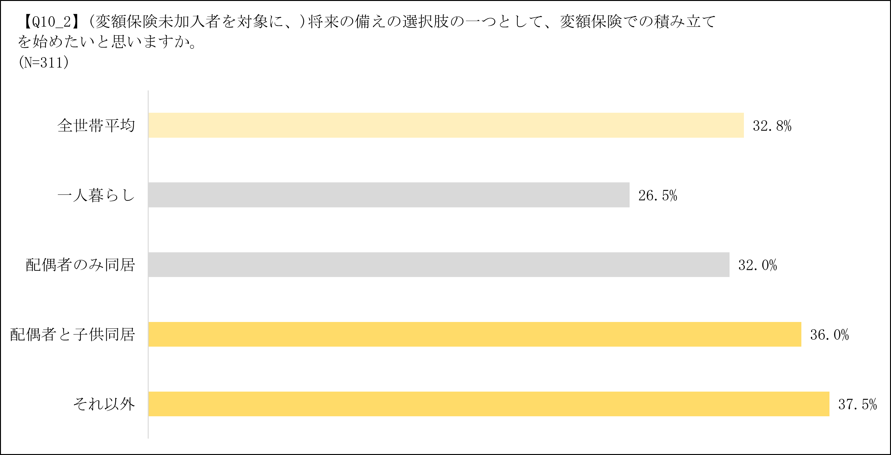・変額保険のメリットを踏まえ、変額保険未加入者で配偶者と子供の双方、もしくはそれ以外の家族と同居している方の加入意向は、一人暮らしの方に対して約9ポイント、配偶者のみと同居の方に対して約4ポイント高い結果となった。