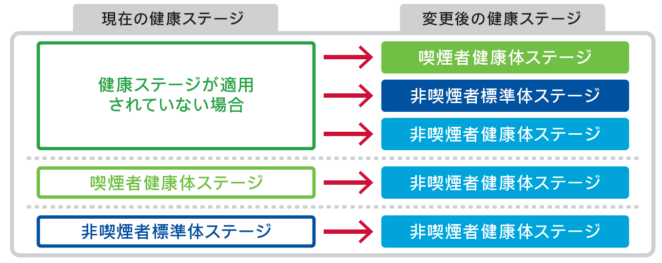 加入時に「健康ステージ」を適用できなかった場合でも、ご契約後の所定の期間内に当社の定める健康状態(過去1年間以上喫煙歴がないなど)を満たした場合には、新たに健康ステージの適用もしくは変更ができます。