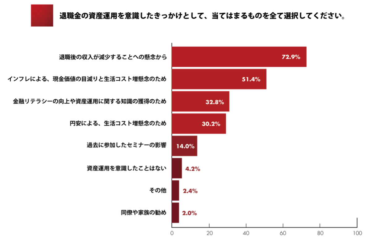 退職金の運用を意識したきっかけとして、1位は「退職後の収入が減少することへの懸念から」が73%、2位「インフレによる、現金価値の目減りと生活コスト増懸念のため」が51%という結果となりました。昨今のインフレにより、退職後の家計収支への懸念が、資産運用を考えるきっかけになっていることがわかります。