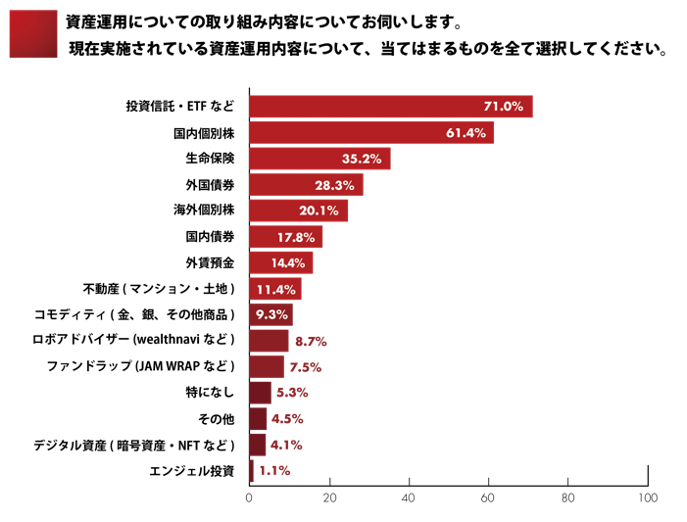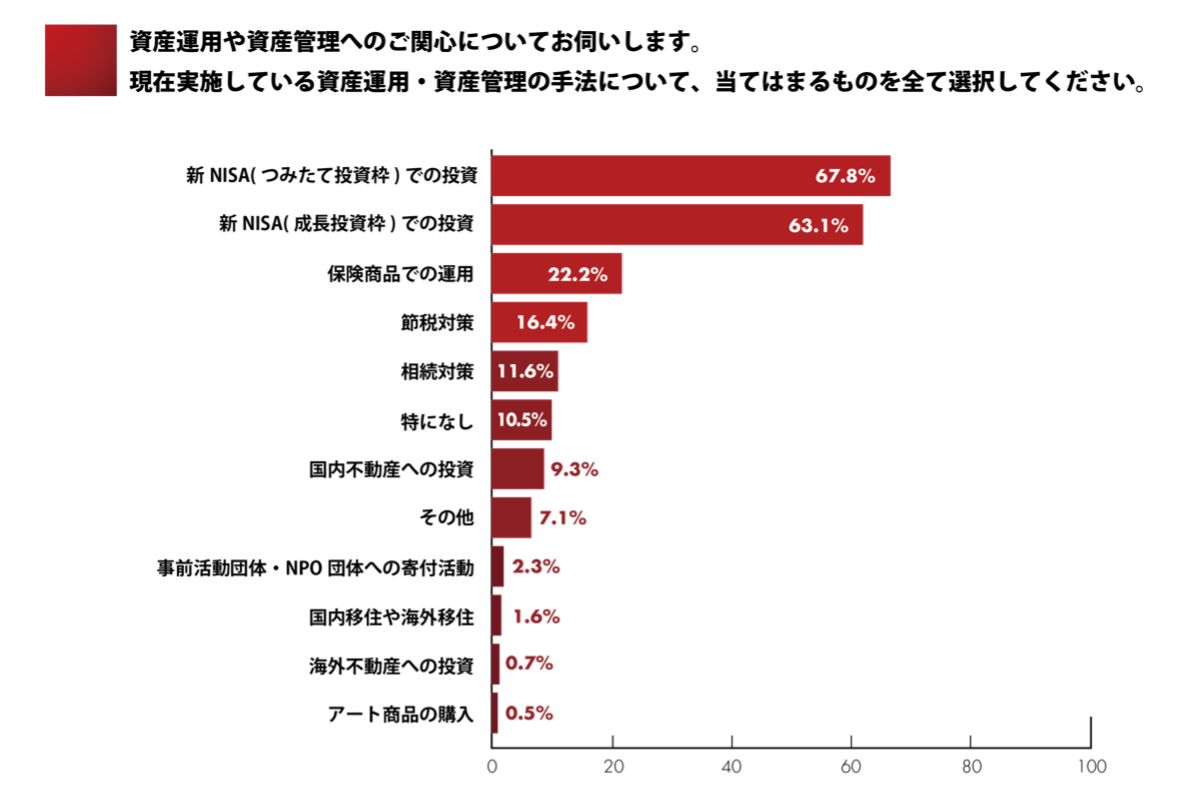 現在実施している資産運用や資産管理の手法について、1位が「新NISA(つみたて投資枠)での投資」が68%、2位「新NISA(成長投資枠)での投資」が63%と、6割以上が新NISAを活用している状況が見られます。