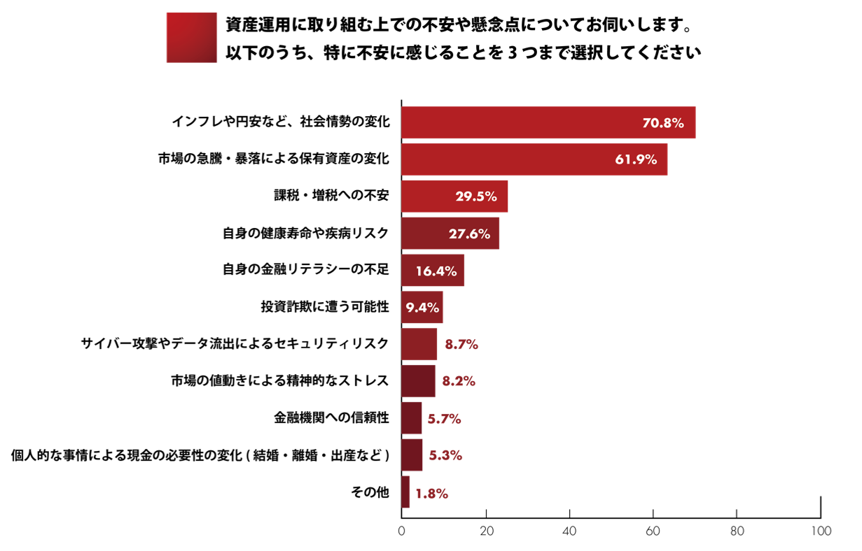 資産運用に取り組む上での不安や懸念点について、71%が「インフレや円安など、社会情勢の変化」と回答。次いで、「市場の急騰・暴落による保有資産の変化」が62%、「課税・増税への不安」が30%の結果となりました。