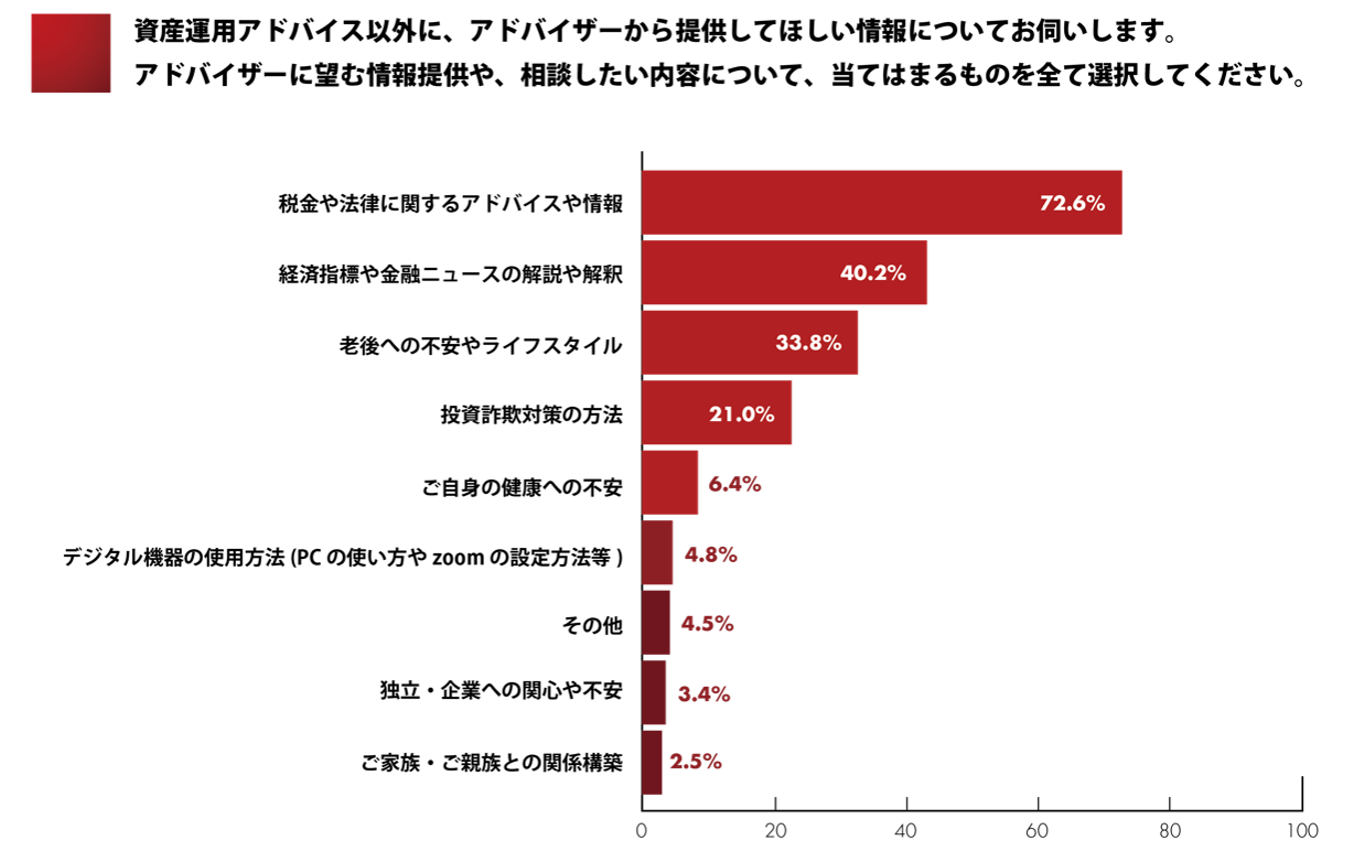 資産運用アドバイス以外に、アドバイザーから提供してほしい情報について、「税金や法律に関するアドバイスや情報」が73%、次いで「経済指標や金融ニュースの解説や解釈」が40%の結果となりました。先日公表された骨太の方針では言及されなかった「退職金課税」を含め、税金の動向を注視している退職者層が多いことが伺えます。