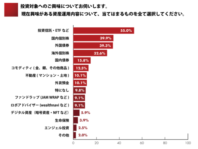 注目すべきは、今後の投資意向における国内外の傾向の変化です。「国内個別株」への関心は現在の61%から今後は40%へと21%減少する一方、「海外個別株」は現在の20%から今後は33%へと13%増加。