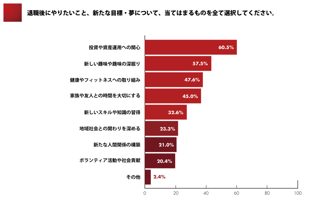 退職後にやりたいこと、新たな目標・夢についての調査では、「投資や資産運用への関心」の回答が60%、「新しい趣味や趣味の深掘り」が58%、次いで「健康やフィットネスへの取り組み」が48%と、退職後へのポジティブな意欲が見られました。