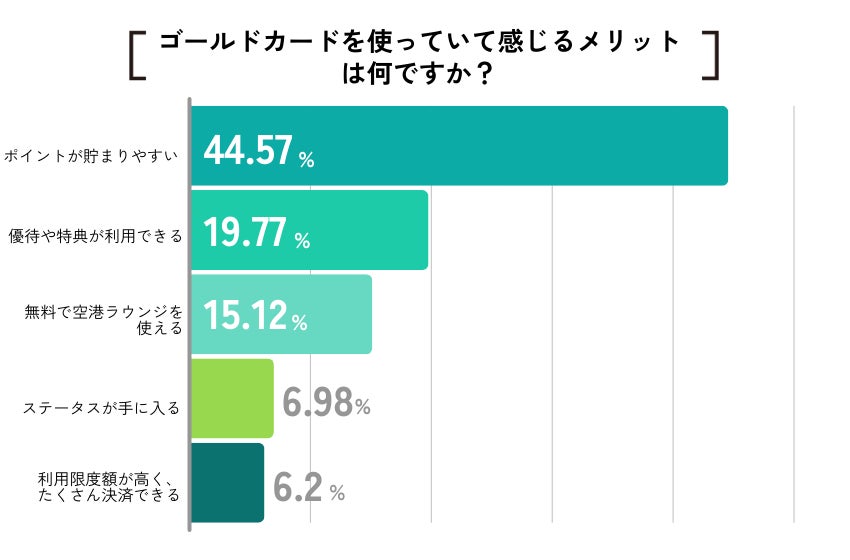 ゴールドカードを使っていて感じるメリットは、「ポイントが貯まりやすい」が44.57%と最も多かった。