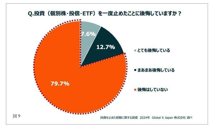 なお投資を一度止めたことについては、約8割の人が「後悔をしていない」と回答しており、運用方針を変えて成果に繋がったことが、後悔のない投資運用にも繋がっているようです。(図9)