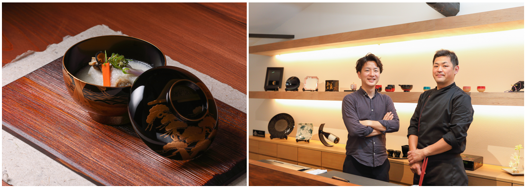輪島塗など美しい漆器でお食事を堪能できる金沢市内のレストラン「CRAFEAT」では、2024年11月30日まで、【能登応援プラン】をご提供。能登の食材をふんだんに用いたコース料理を輪島塗でお楽しみいただけます。普段使いしにくいと思われがちな漆器がぐっと身近なものになるでしょう。輪島塗のお箸をお土産にプレゼント。