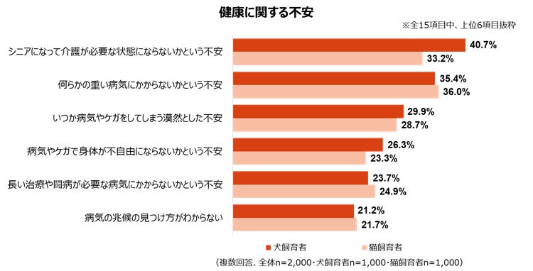 まず、ペットの健康に関する不安を尋ねたところ、犬・猫飼育者ともに「シニアになって介護が必要な状態にならないか」「何らかの重い病気にかからないか」といった不安が上位になりました。