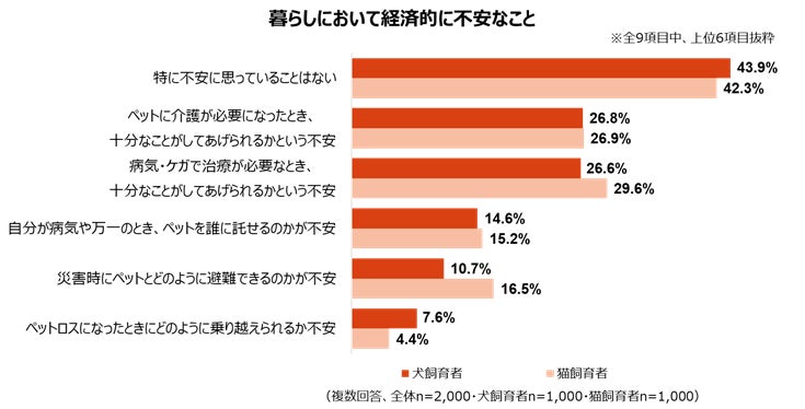 一方で、「特に不安に思っていることはない」との回答が4割程度と、最多になっており、終生飼養を念頭に、経済面についても事前に検討の上で、責任を持ってペットをお迎えしている様子も窺える結果となりました。