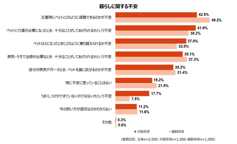 ・ ペットとの暮らしに関する不安は、犬・猫ともに「災害時にペットとどのように避難できるのか」