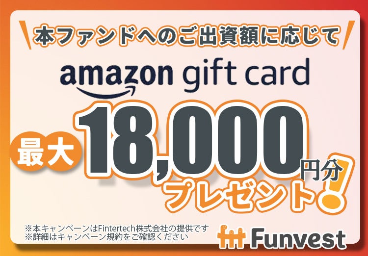 本ファンドへ出資していただいた投資家の皆様を対象として、出資額に応じて最大18,000円分のAmazonギフトカードをプレゼントするキャンペーンも併せて実施いたします。