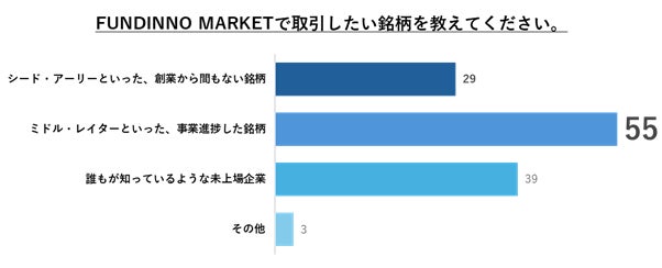 また、続いての質問は、取引したい銘柄についてですが、ミドル・レイター企業を望む声が70%を超えました。続いて、知名度が高い銘柄と続き、セカンダリーマーケットではある程度の進捗があった企業へ投資したいという意向がうかがえます。