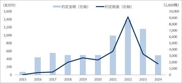 現在の株主コミュニティ制度について統計データをみてみると、表1より、9社の証券会社で約50の銘柄を取り扱っており、参加している投資家は約26,000人います。株主コミュニティ制度は2015年にできた比較的新しい制度ですが、グラフ1を見ると、2015年以降、運営会社や銘柄数は徐々に伸びてきています。グラフ2では、取引量について記載されています。2021年頃から伸びて2022年には14億円ほどの取引量がありますが、資金調達などが行われている発行市場と比較すると、発展途上の制度と言えます。
