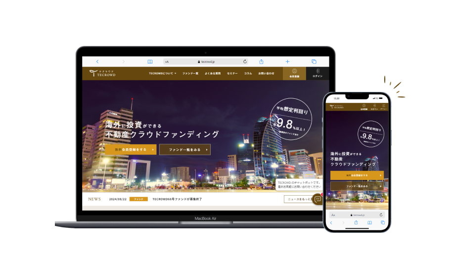 TECROWDは1口10万円から不動産に投資ができるサービス(クラウドファンディング)です。投資するにあたり物件選びから契約まで、すべてオンラインで完結するため、気軽に不動産への投資が始められます。