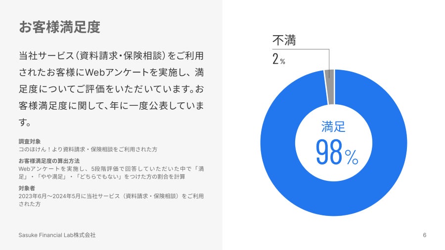Sasuke Financial Lab株式会社(本社:東京都千代田区、代表取締役:松井清隆、以下「当社」)が運営する保険の一括比較・見積もりサイト「コのほけん!」(https://konohoken.com/)において「お客さま本位の業務運営方針」(以下、「FD宣言」)における2023年度の取り組み状況(KPI実績)を公表いたしました。