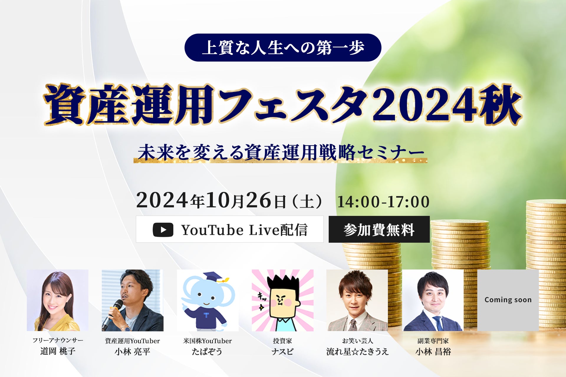 2024年10月26日(土)に開催される「資産運用フェスタ2024【秋】」(以下「本フェスタ」)では、そんな資産運用に成功している豪華6名のゲストの方にご出演いただき、今話題の新NISAや株式投資や不動産投資など、知っていれば豊かな未来が拓ける資産運用方法について解説いたします。本フェスタはフリーアナウンサーの道岡桃子さんと日本初の副業専門スクール「副業アカデミー」の学長であり副業専門家の小林 昌裕氏が司会を務め、六部構成でお送りします。