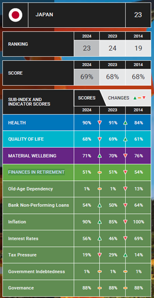 「退職後の資金」指数は、昨年のスコアと順位を維持しました。過去1年間のインフレ指標のスコア上昇にもかかわらず、他国の躍進により、順位は3位から14位へ後退しました。しかし、日本の賃金は上昇しており、インフレ率が間もなく目標に達するという希望もあり、日銀は3月に8年間続いたマイナス金利に終止符を打ち、政策金利の0 ~ 0.1%への引き上げを発表しました。次いで7月31日には0.25%への引き上げを発表しました。