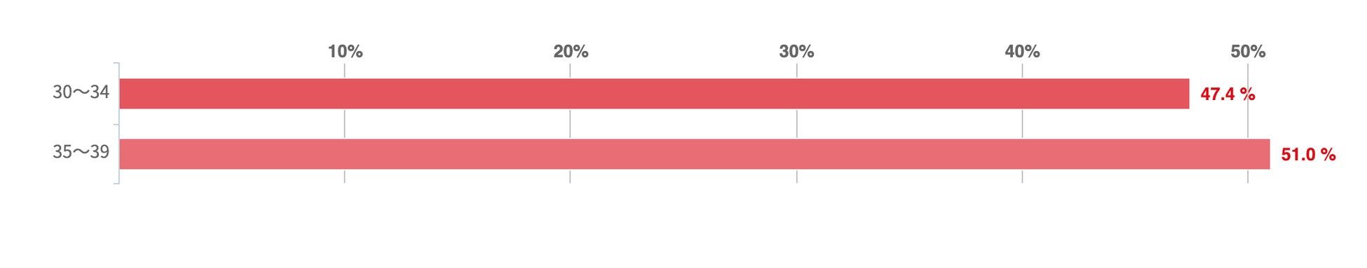 回答者の詳細な運用資産の割合について見ていくと、「20%〜40%台(33.0%)」が最も多くなり、次いで「20%未満(32.5%)」「50%~70%台(24.7%)」が並ぶ結果となった。この分布から、運用割合を4割以下に抑えている30代が6割以上で過半数を超えていることが読み取れる。