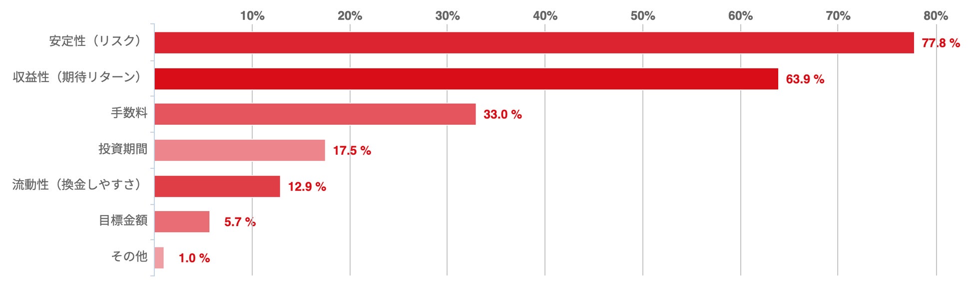 アンケートによれば、30代が運用先を選ぶ際には「安定性(リスク)」と「収益性(期待リターン)」を重視する声が多く、それぞれ77.8%と63.9%の回答者が選択している。