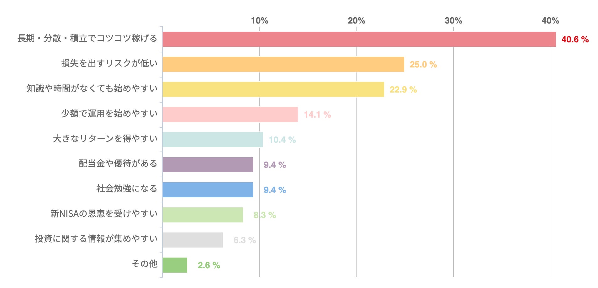 アンケートによれば、投資信託をおすすめする理由として「長期・分散・積立投資がしやすく、安定的に利益を積み重ねられる」点を挙げた回答者が40.6%で最も多かった。同時に、「損しにくい(25.0%)」「運用する時間がなくても始めやすい(22.9%)」「少額で運用を始めやすい(14.1%)」と回答した30代も多かった。