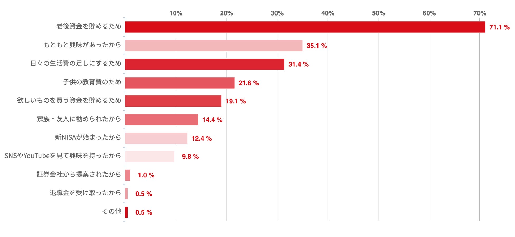 資産運用を始めたきっかけには「老後資金を貯めるため」「興味があったから」「子供の教育費のため」などが挙がり、より安定した将来を築こうとしていることが読み取れる。