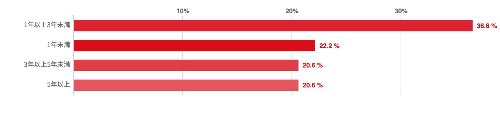 アンケートによれば、30代の運用経験の分布は「1年以上3年未満」が36.6%で最も多く、次いで「1年未満」が22.2%、そして「3年以上5年未満」と「5年以上」がそれぞれ20.6%で並ぶ形となった。