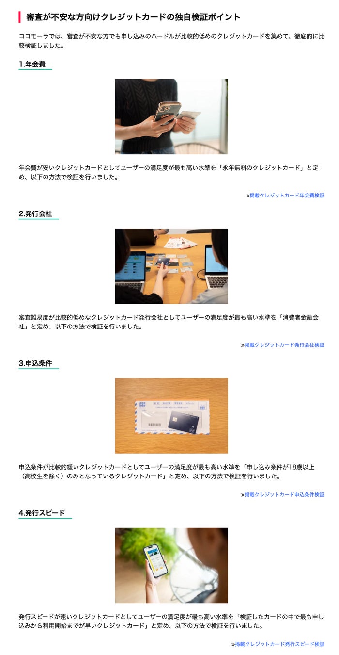 ココモーラでは、機能やカードランク、属性などのジャンル別にページを作成し、各ページの内容に合わせて最適なクレジットカードを紹介しています。