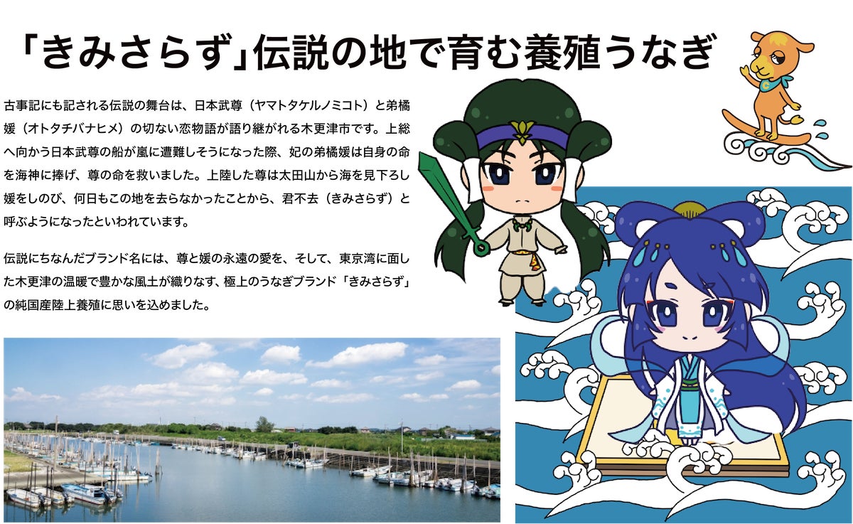 古事記にも記される伝説の舞台は、日本武尊(ヤマトタケルノミコト)と弟橘媛(オトタチバナヒメ)の切ない恋物語が語り継がれる木更津市です。上総へ向かう日本武尊の船が嵐に遭難しそうになった際、妃の弟橘媛は自身の命を海神に捧げ、尊の命を救いました。上陸した尊は太田山から海を見下ろし 媛をしのび、何日もこの地を去らなかったことから、君不去(きみさらず)と呼ぶようになったといわれています。 伝説にちなんだブランド名には、尊と媛の永遠の愛を、そして、東京湾に面した木更津の温暖で豊かな風土が織りなす、極上のうなぎブランド「きみさらず」 の純国産陸上養殖に思いを込めました。