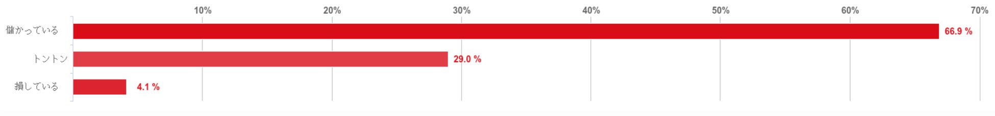 アンケートによれば、「儲かっている」が66.9%と過半数を超える結果となった。一方で「トントン」、すなわち損失と利益が相殺されている人は29.0%、「損している」人は4.1%に留まった。
